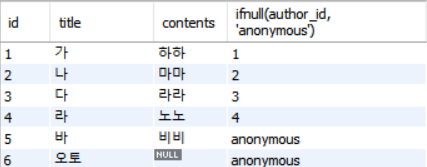 select id, title, contents, ifnull(author_id, 'anonymous') from post;