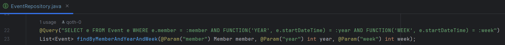 → FUNCTION('YEAR', e.startDateTime)과 FUNCTION('WEEK', e.startDateTime)는 각각 startDateTime 필드의 연도와 주를 반환