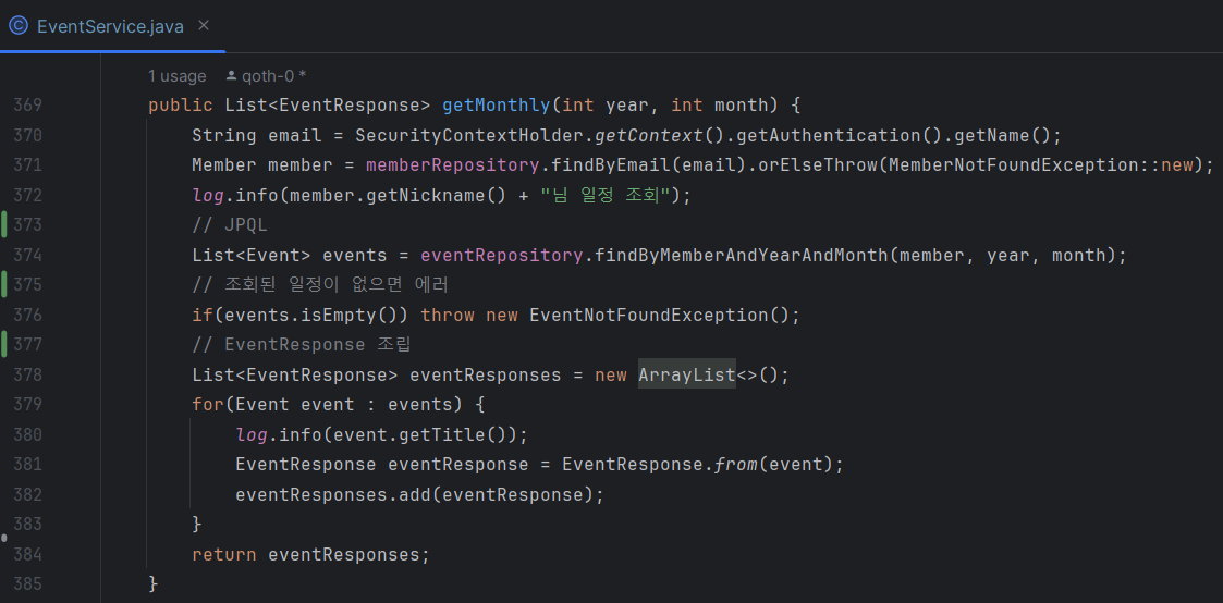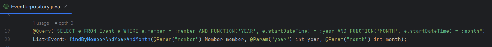 → @Param("member"), @Param(" year"), @Param("month")를 통해 쿼리 내에서 :member, :year, :month로 매개변수들을 참조할 수 있음